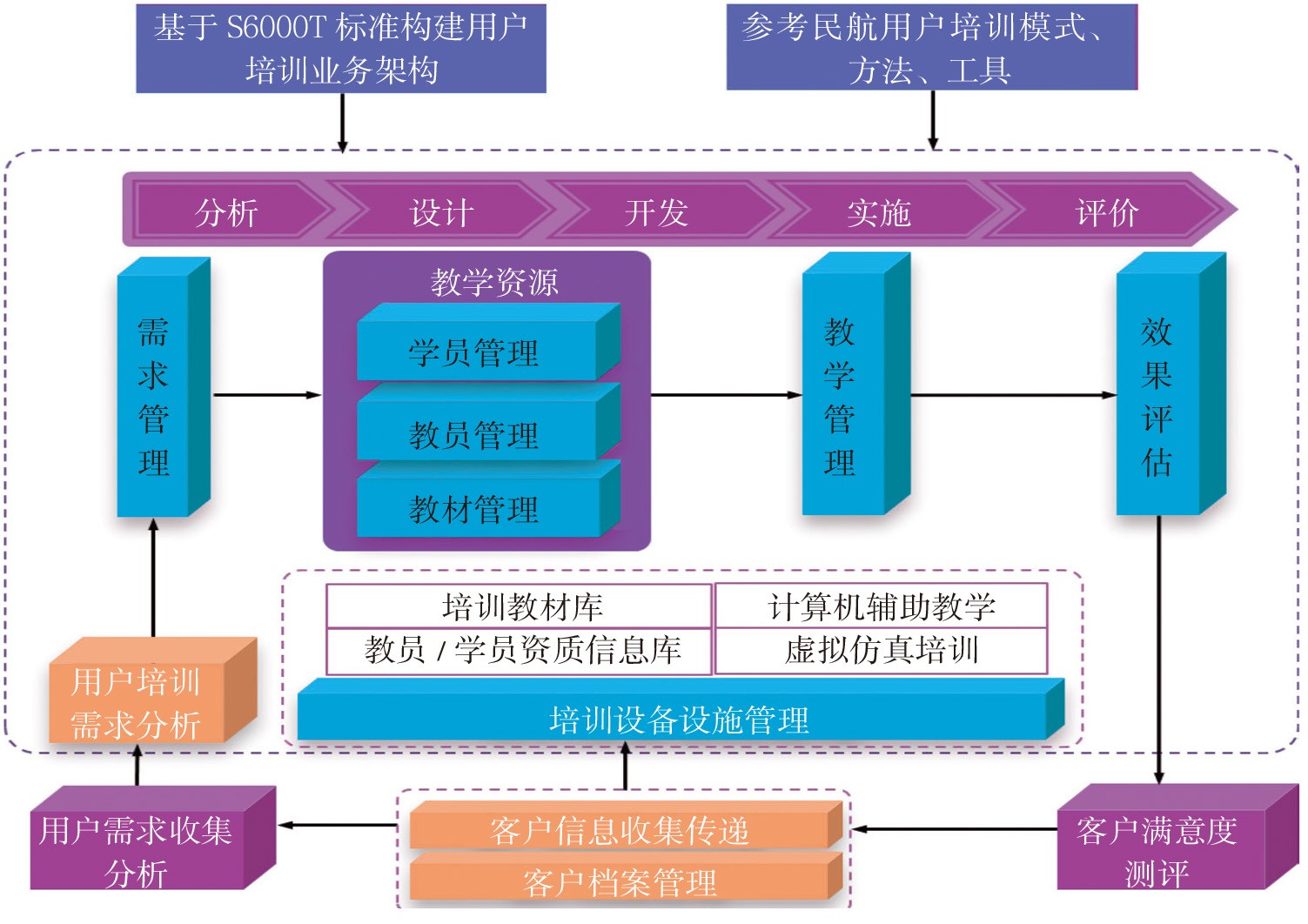 AEOS服务保障体系建设与应用过程中,参考S6000T标准的架构和内容,设置了用户培训业务域。通过编发体系文件的方式,提炼最佳实践,汇聚行业智慧,凝聚行业共识,规范用户培训过程中的需求管理、教材管理、教学管理、教员管理、学员管理、教学效果评估等工作,相关业务逻辑如图7所示。