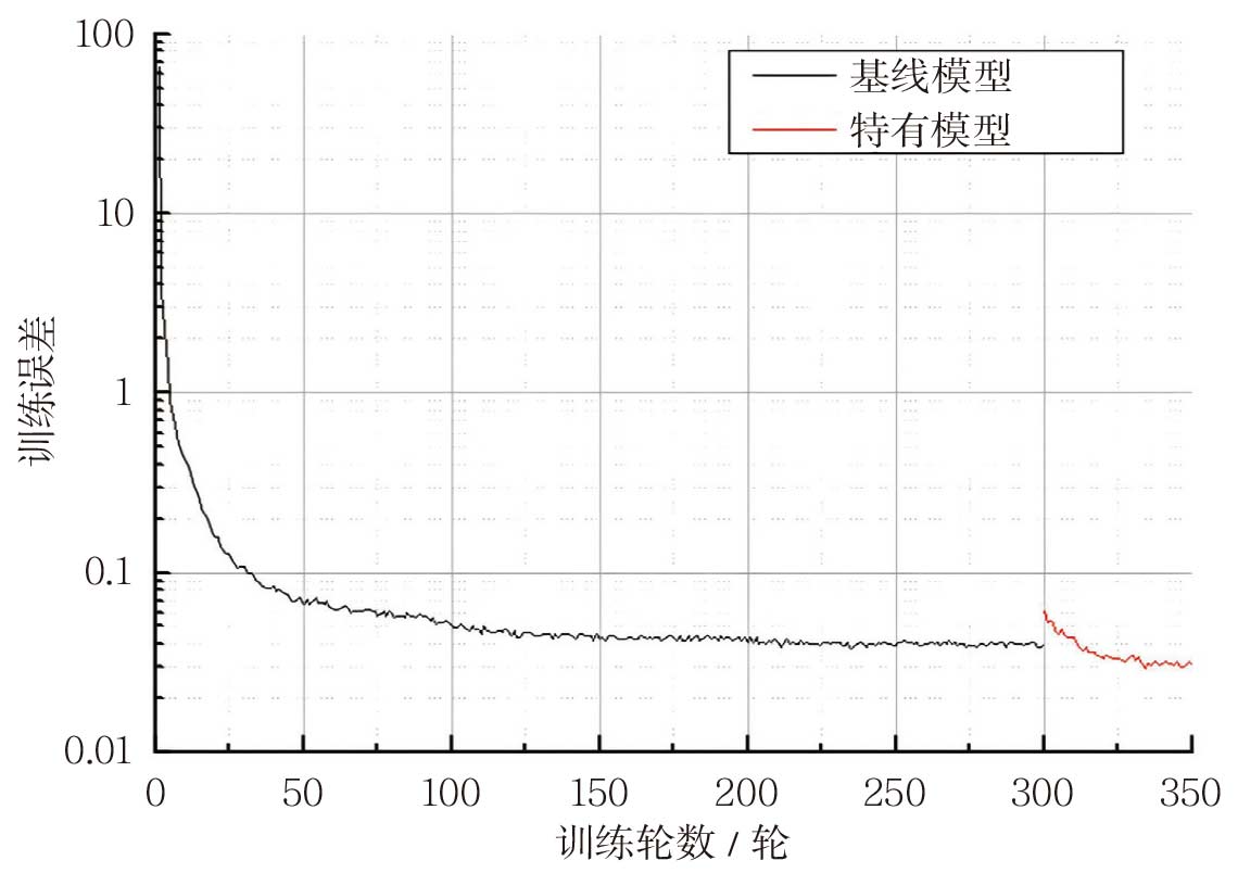 发动机特定模型训练时,选取每台发动机前10个飞行架次数据作为迁移模型的输入,特有模型训练过程与精度如图 6所示。可以看出,对于该台发动机,仅20余次迭代,模型就已经收敛,且模型误差较基准模型有一定的下降,这表明特有模型可以更好地表示该台发动机的特性。