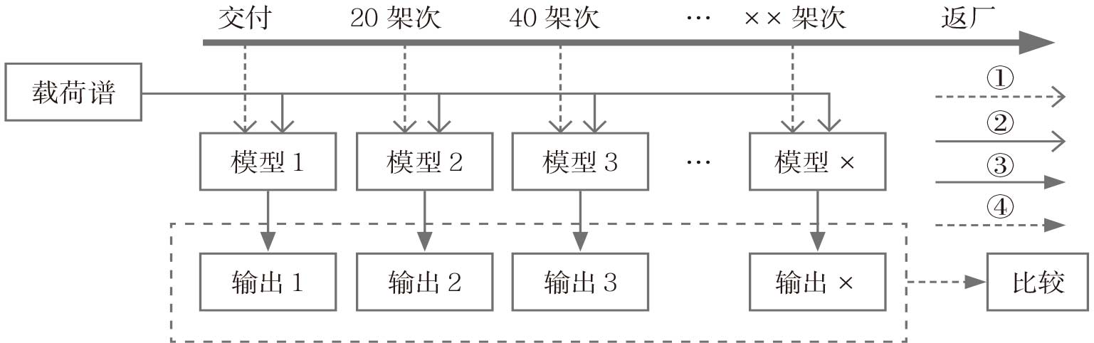 发动机每次飞行时,由于训练科目或者作战任务不同,其载荷谱有较大差异。为了更好地衡量发动机的偏移情况,本文通过图8所示方法进行研究。首先,对发动机进行时间段的划分,根据发动机的统计使用寿命,把发动机分为数个服役阶段,并利用迁移学习的方法在每个服役阶段建立精度较高的发动机数据驱动模型;然后,建立各服役阶段模型,从各类用户实际角度出发,选取了几个典型载荷谱;随后,将载荷谱作为输入,利用各个服役阶段的模型输出各阶段模型的供油情况;最后,分析比较供油情况,结合专家经验对燃油系统退化情况进行评估。