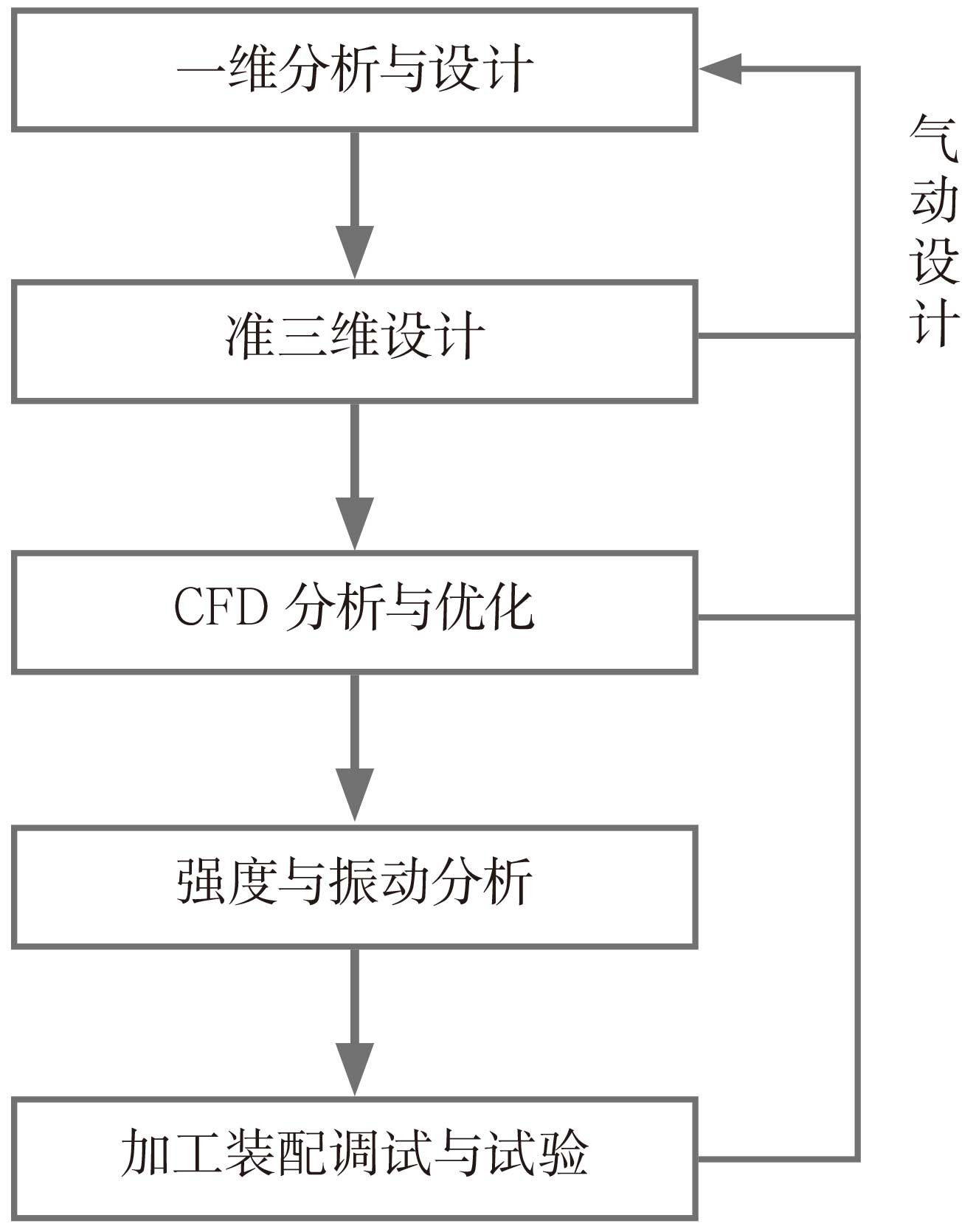 常规叶轮的经验模型和设计准则拓展至高速离心叶轮具有较大的风险和不确定性,因此,高速离心叶轮设计一般采用全新设计思路,即首先进行包括一维分析与设计、准三维设计、全三维计算流体力学(CFD)分析与优化3个子任务在内的气动设计,随后计算校核强度和振动特性,并进行样机的加工、装配、调试与试验,最后获得符合设计要求的压气机(见图2)。其中,气动设计的目的是在给定的尺寸、转速等约束条件下,计算通流几何参数,满足流量、压比等设计任务,同时尽可能地提高效率、拓宽稳定裕度。下文主要针对气动设计中的几个主要环节进行介绍。