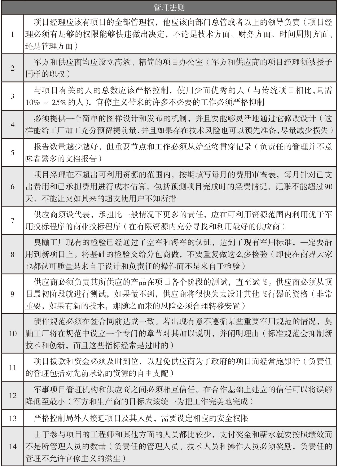 事实上,臭鼬工厂有无数有关自由宽松的创新氛围的案例,在这种环境下,员工内在的创新渴望与自豪感得到很好的激发,人人渴望建功立业。凯利·约翰逊创立的这些管理原则是臭鼬工厂自创建以来高效运作的基础,涉及用户(主要是军方)、供应商、员工等,而特别难能可贵的是,用户、供应商、员工等各方,特别是用户,均认同并愿意遵守这些原则,这是一切成功的关键。