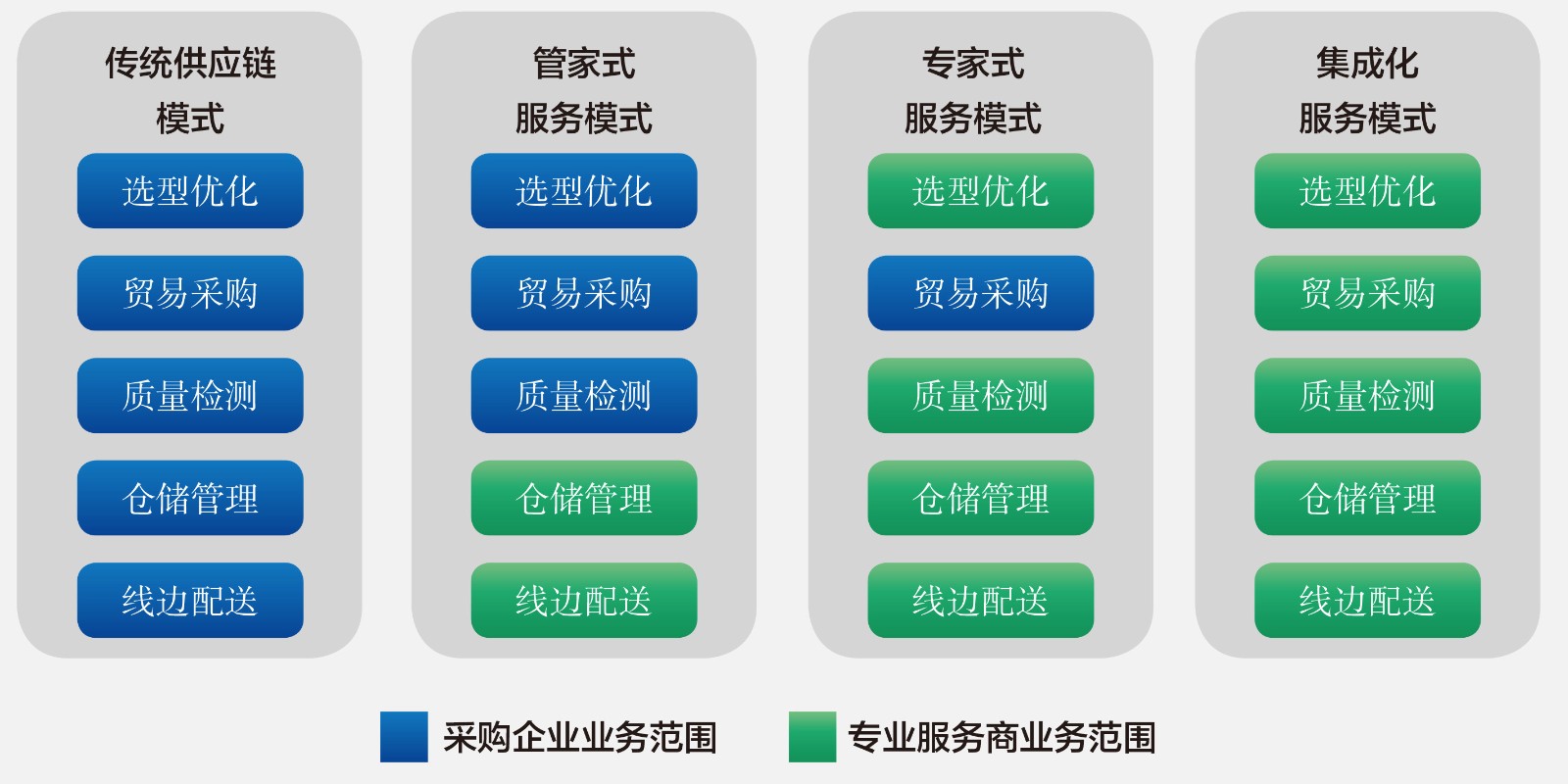 采购企业做的内容越多,就越接近传统供应链模式;相反,专业服务商做的内容越多,就越接近集成化服务模式,也就是越接近以空客公司和波音公司为代表的现代供应链模式。