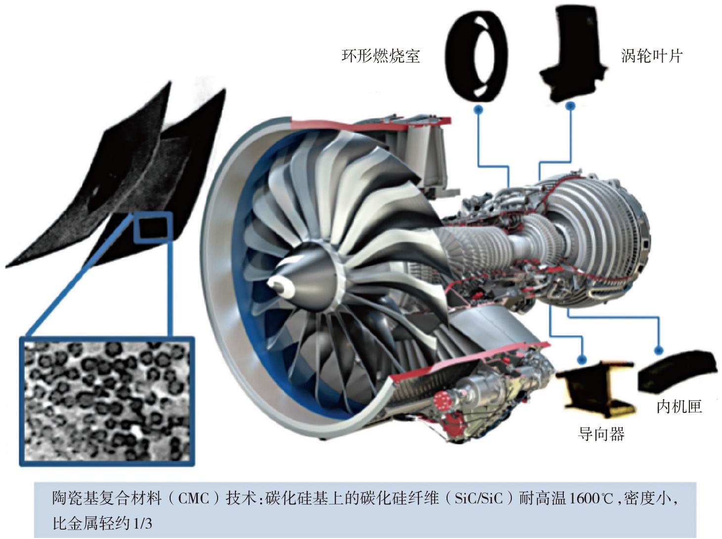 在核心技术与产品方面,标杆企业长期保持具有市场竞争力的基础就是重视已有成熟技术的传承和研发,基于技术成熟市场成功的核心机,大量使用公司储备的设计技术和产品设计经验来实现新产品的衍生发展。为了不断改进产品性能、降低设计成本,标杆企业高度重视复合材料和增材制造技术的应用。例如,GE航空集团目前最倚重的核心技术之一就是高温陶瓷基复合材料(CMC)应用技术(如图2所示),公司为全球首家将CMC技术应用到民用航空发动机燃烧室、导向器、涡轮叶片等热端部件上的标杆企业,截至2019年在大型涡扇发动机上已累计安全使用2.3万亿小时。增材制造技术在航空发动机上的使用日渐成熟,GE航空集团是全球最早实现增材制造工业化的企业之一,已应用于包括LEAP发动机燃油喷嘴等零部件上,产品耐用性提高了4倍。罗罗公司2019年完成了遄达XWB-84发动机低压涡轮密封件的增材制造,零件质量减轻40%以上。为了降低研制风险,提高市场竞争力,强强联合也是标杆企业常用的战略手段。例如,罗罗、赛峰和德国MTU联合研制第四代先进涡轴发动机RTM322(配装NH-90直升机)和MTR390(配装HAD“虎”直升机),取得巨大成功;赛峰集团和GE航空集团平股合资的CFM国际公司研制的CFM56发动机缔造了一个时代传奇,运营30多年来累计交付数超2.8万台。